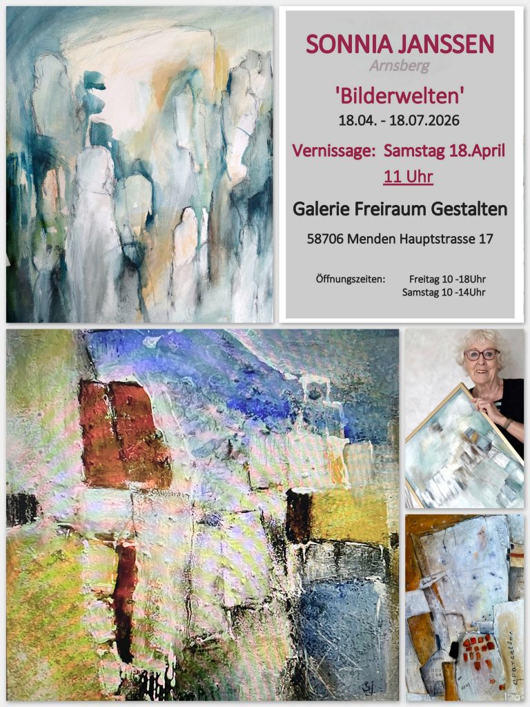 Die Ausstellung „Bilderwelten“ von Sonnia Janssen wird am Samstag, den 18. April 2026 um 11 Uhr in der Galerie FreiraumGestalten an der Hauptstraße 17 in Menden im Rahmen einer Vernissage eröffnet und dauert bis zum 18. Juli 2026.