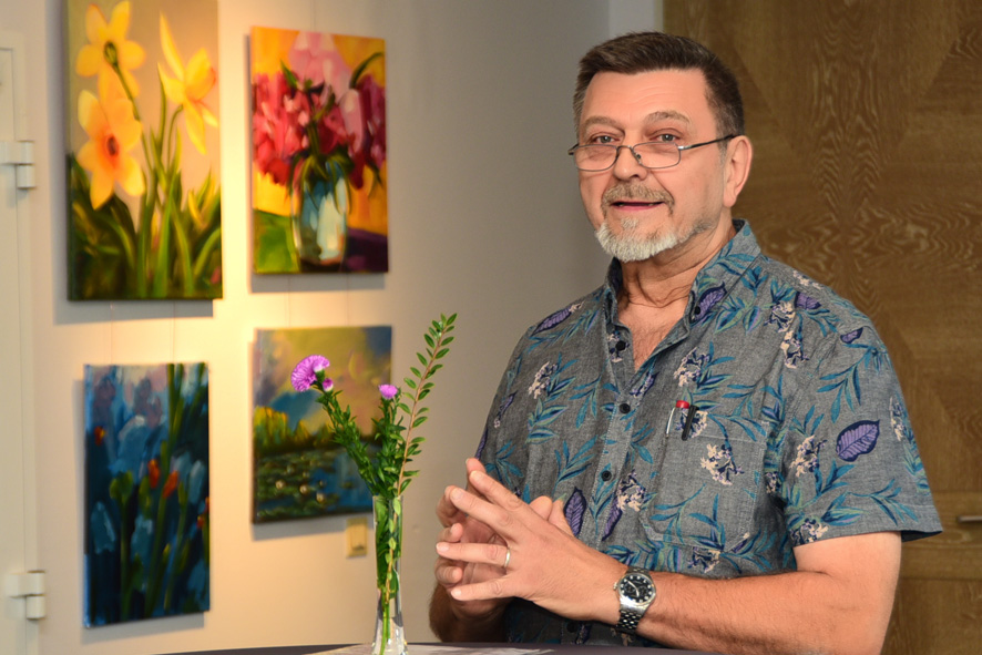 Alexander Wotschel präsentiert im Foyer des Mendener Rathauses die Werke seiner Schüler der VHS und der Seniorenkunstgruppe Hansa. Basierend auf der Farblehre der sieben Kontraste