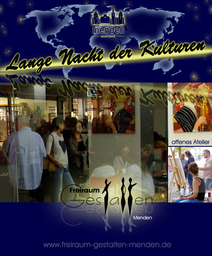 Wir freuen uns Sie auf unseren Seiten begrüßen zu dürfen. Die „FreiraumGestalten“ sind eine Gemeinschaft Mendener Künstler, die sich aus dem Arbeitskreis „Bildende Kunst“ (initiert vom Kulturbüro Menden) zusammengeschlossen haben. Auf diesen Seiten stellen wir uns und unsere Arbeiten vor, informieren über Ausstellungen und Events, an denen wir mitwirken und bieten Kontaktmöglichkeiten zu den einzelnen Künstlern.