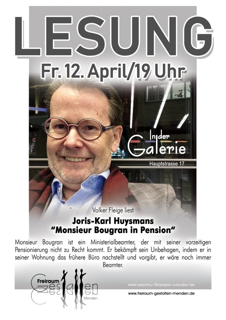 Volker Fleige gibt sich französisch In der Galerie der FreiraumGestalten wird wieder gelesen. Am Freitag den 12. April ab 19 Uhr liest Volker Fleige „Joris-Karl